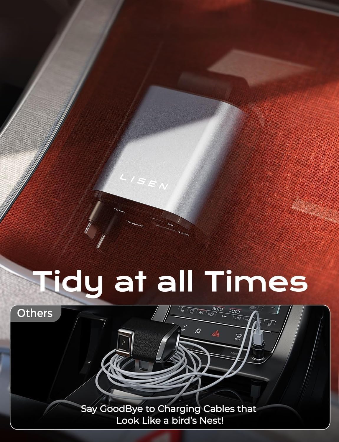 🔗 No more cable clutter! Our charger has a flexible and scalable design that pulls the cables within 80cm. 🧹 It automatically retracts for internal storage, keeping your car clean and tidy. 🚮